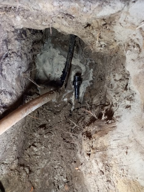 Op 21 januari 2022 zijn de laatste werkzaamheden, om rechtstreeks bij het PWN aangesloten te worden, voltooid. Onze installateur Mark vd Aa klopte 3 x op de grond en er was water. Links de aansluiting in de meterkast en rechts de afsluiting van de leiding die ons decennia lang van water voorzien heeft. Dit kwam via de voetbal. Wij zijn nu echt zelfvoorzienend.